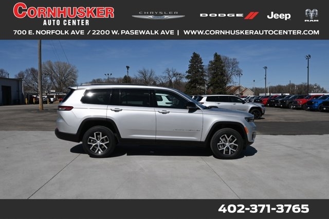 Experience luxury, performance, and advanced technology with the 2025 Jeep Grand Cherokee L Altitude X 4X4. Powered by a 3.6L V6 24-valve VVT engine with ESS producing 293 horsepower and 260 lb-ft of torque, this SUV features an 8-speed automatic transmission and the dependable Quadra-Trac IĀ® 4WD system for confident handling in all conditions. It achieves an EPA-estimated 18 MPG city and 25 MPG highway, making it ideal for both daily drives and weekend getaways. Inside, enjoy Capri leatherette and suede seats, a 10.25-inch TFT color display, and a 3-zone automatic climate control system for maximum comfort and convenience. Safety features include Adaptive Cruise Control with Stop and Go, Full-Speed Forward-Collision Warning Plus, ParkSenseĀ® Rear Park-Assist with Stop, Blind-Spot and Cross-Path Detection, and Rear-Seat Object Alert. Finished in striking Velvet Red Pearl-Coat with gloss-black exterior accents and 20-inch gloss-black painted aluminum wheels, this Grand Cherokee L Altitude X stands out wherever you go. With an MSRP of $50,175 including destination charge and comprehensive warranty coverage, the 2025 Jeep Grand Cherokee L Altitude X 4X4 is ready to elevate your driving experience. Visit Cornhusker Auto Center at 700 E Norfolk Ave, Norfolk, NE 68701 today and see why this SUV is the perfect choice for your next adventure.