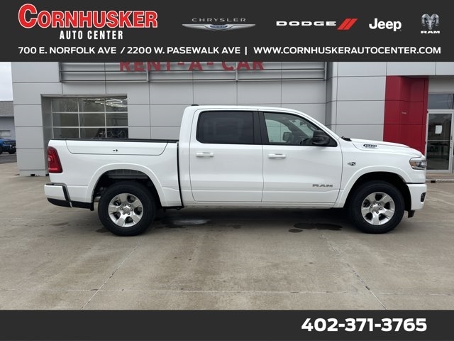 The 2026 RAM 1500 Crew Cab Pickup in Bright White Clearcoat is the perfect combination of power, performance, and style. Under the hood, you'll find the robust 5.7L V8 HEMI engine paired with an automatic transmission, delivering impressive towing capacity and a smooth, responsive ride. The 4WD drivetrain ensures that you can take on any terrain with confidence, whether you're heading off-road or navigating city streets. Inside, the spacious black interior offers comfort for all passengers, with plenty of room for both people and cargo. This truck is equipped with a range of premium features, including adaptive cruise control, ParkView rear backup camera, blind spot and cross path detection, and full-speed forward collision warning. You'll also enjoy the convenience of a remote start system, hill start assist, and a premium audio system. With an EPA estimated 20 MPG on the highway and 16 MPG in the city, the 2026 RAM 1500 gives you the power you need without sacrificing efficiency.Ready to experience this incredible truck for yourself? Visit us today at Cornhusker Auto Center, 700 E Norfolk Ave, Norfolk, NE 68701---your local New Car Dealership in Nebraska. We're just minutes away and ready to help you drive away in your new RAM 1500!