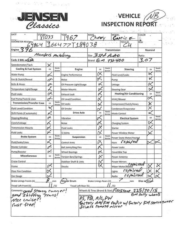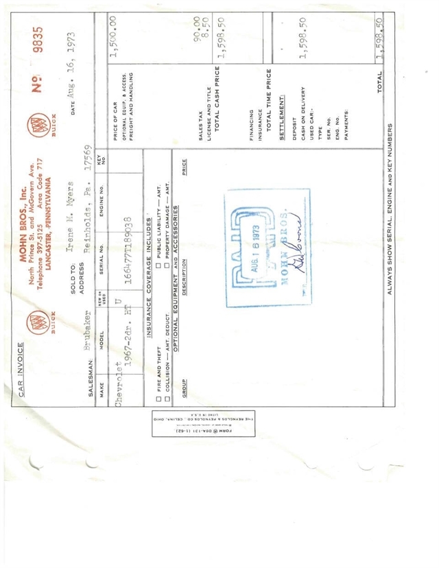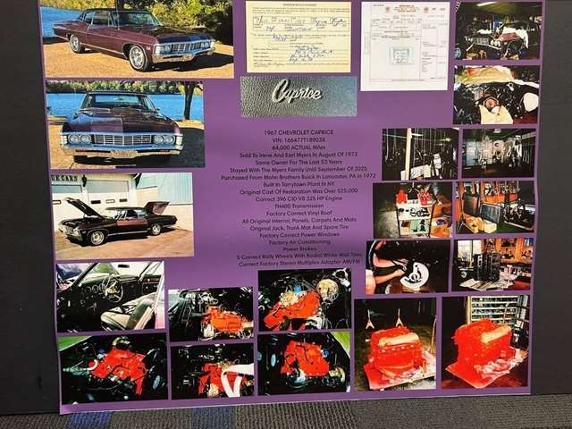 1967 Chevrolet Caprice • 64k actual miles • Same owner for the last 53 years • Sold to Irene and Earl Myers in August 1973 • Built in Tarrytown, NY plant • Restored – engine and engine compartment (see pictures) • Number matching 396 CI V-8 325 HP engine • TH400 transmission • Cold factory air conditioning • Power windows • Power steering • Power brakes • 5 Correct Rally Wheels with Radial White wall tires • All original interior, panels, carpet, and mats • Correct factory stereo multiplex adapter AM/FM • Factory correct vinyl roof • Original jack, trunk mat and spare tire • Original owner’s manual and original purchase agreement