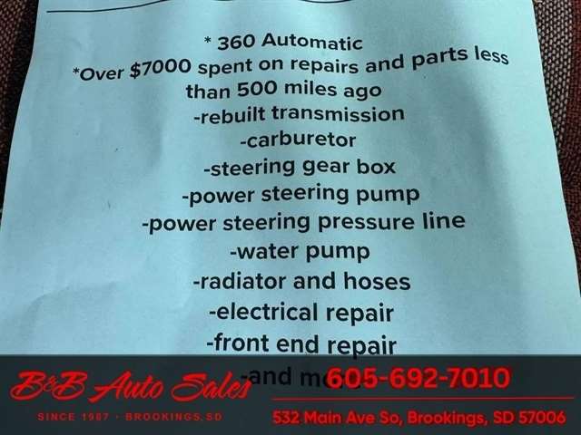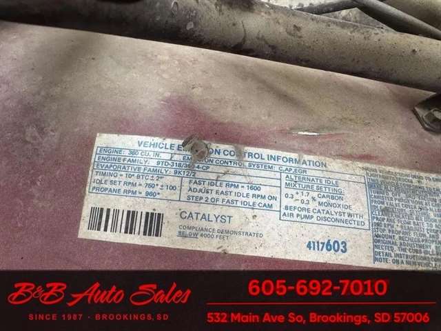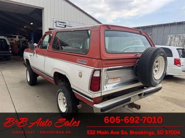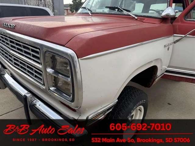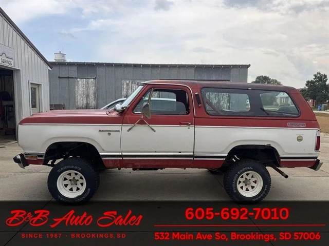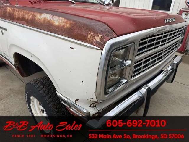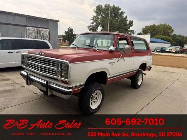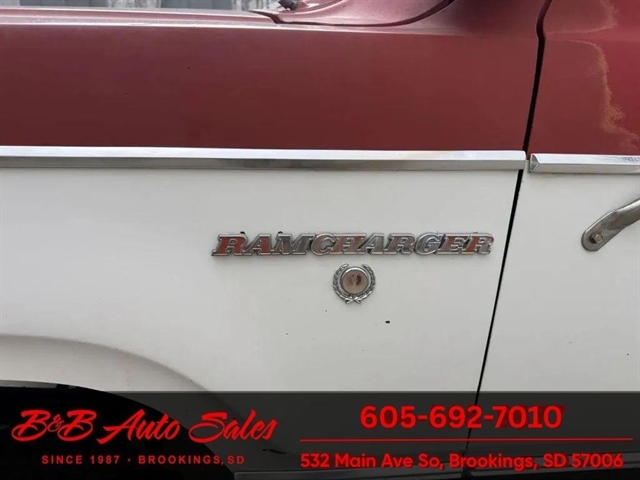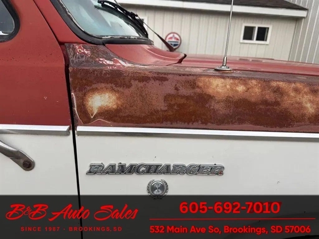 * 360V8* Automatic* AC MECHANICAL- This Ramcharger is going thru our inspection. Mechanically it has had over $7000 spent on it by the previous owner. I do not have any receipts. ****EXTERIOR- The body is in good shape and original. It has patina with faded paint but pretty clean with just some smaller spots of rust the rear wheels . See the video for an up close inspection. Text Dirk at 605-695-7391 for running and driving video`sINTERIOR- The interior is original and complete. It needs drivers seat cover and dash is cracked. Carpet is original. DIRK`S COMMENTS- With 38 years of experience I will give you my opinion of the Ramcharger. It is a full top Ramcharger so you can take the top off and have a 4wd convertible. These are cool to have the top able to come off where the newer ones do not. Runs and drives good so use as is or restore. UNDERNEATH- The underneath is solid . History- A Ramcharger from Montana. TEST DRIVE- We personally test drive our vehicles so we know what they drive like. I have drove this one 20 miles and it drives good.Located in White, SDBUY WITH CONFIDENCE as this 1979 Dodge Ramcharger has gone thru inspection and test drive. We personally work and drive these ourselves so can answer any questions you may have. We show you any issues with over 100 pictures and videos of a walk around, running and driving.VALUE- We price our vehicles to market value and try to be one of the best prices of vehicles in comparable condition. Our goal is to give you a good buy on a vehicle you are going to have fun with and enjoy. We do have a document fee but only $50 which is lower than most other dealers.LIKE IT OR RETURN IT- As being in business for 38 years we do not want to sell anybody a vehicle they do not want. As many of our vehicles are sold site unseen we will take the vehicle back and give a refund minus shipping and a restocking fee. You are responsible for the shipping both ways and a $1000 restocking fee. You have 3 days to notify us you are not happy with the vehicle and we will start the return process. Ask for more details.VIDEOS- Call, text or email for videos of driving the vehicle and of the engine running and accessories working. Text Dirk at 605-695-7391. Click here to apply for financing: Credit App Call or text Dirk at 605-695-7391 or Darren 605-695-9555 with any questions. B and B Auto Sales, 324 W Main White SD 57276