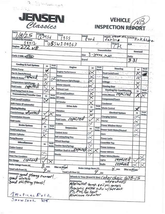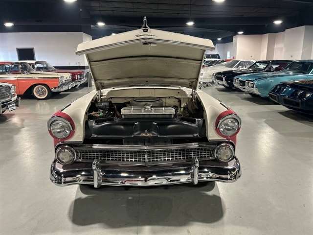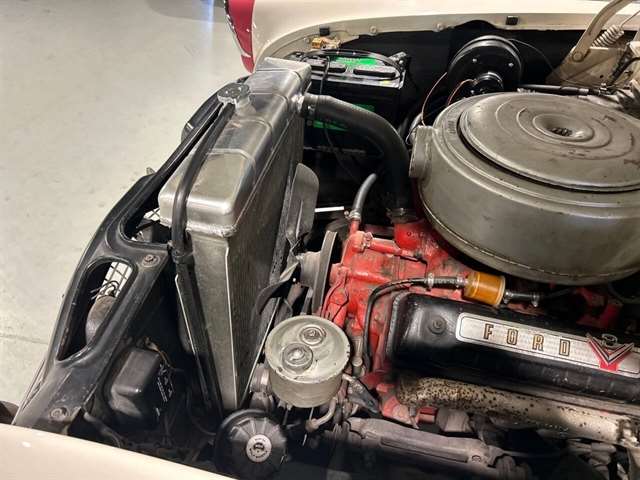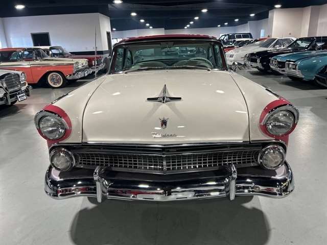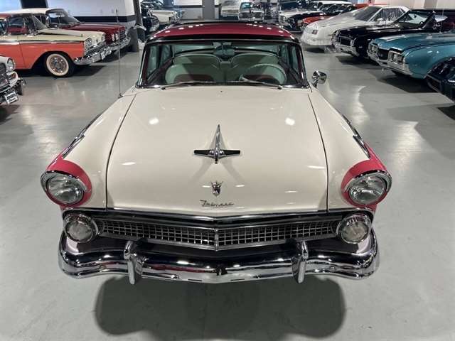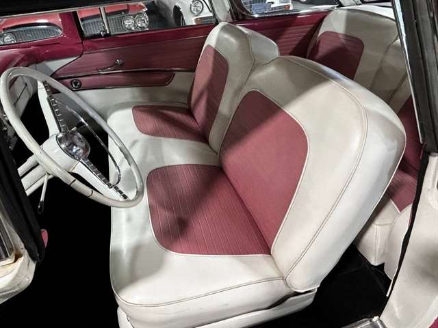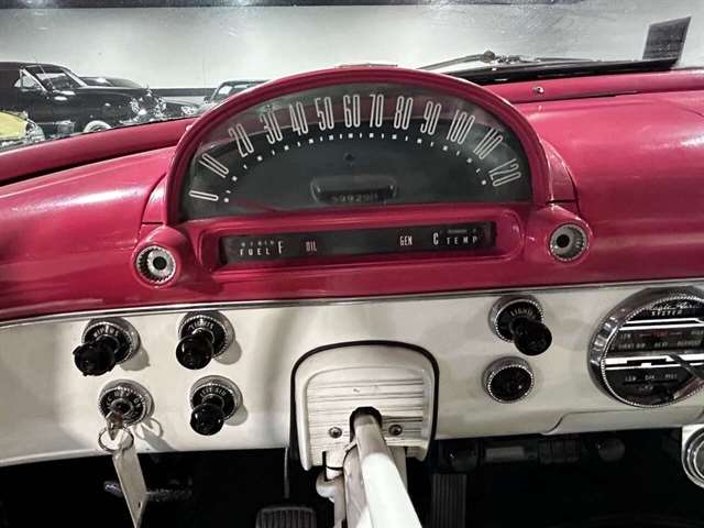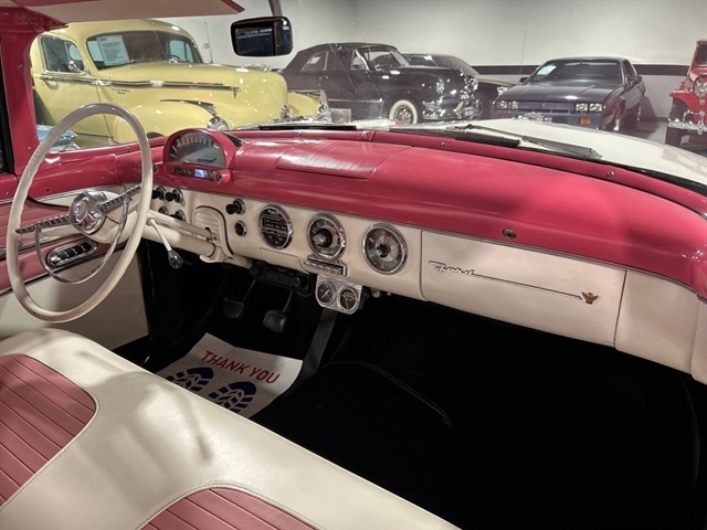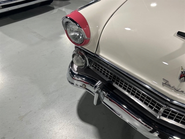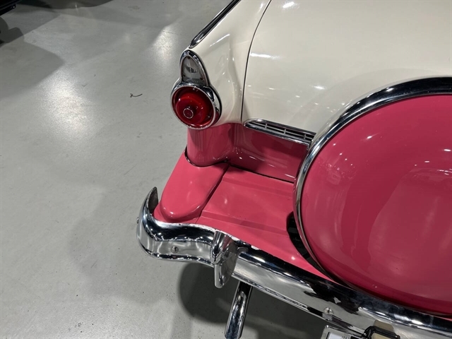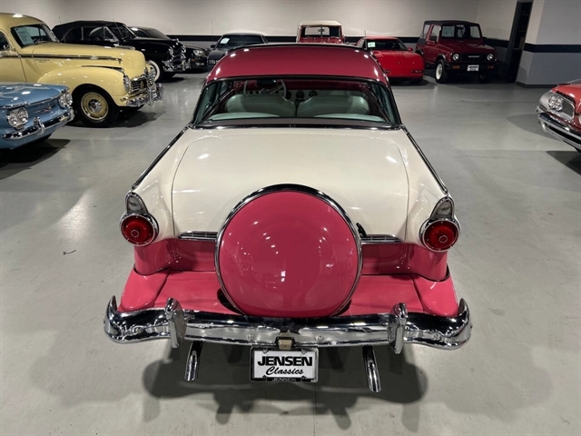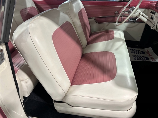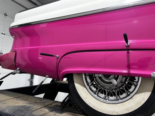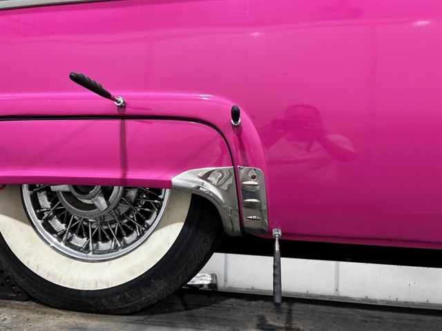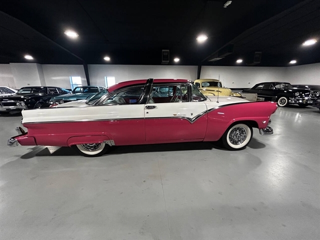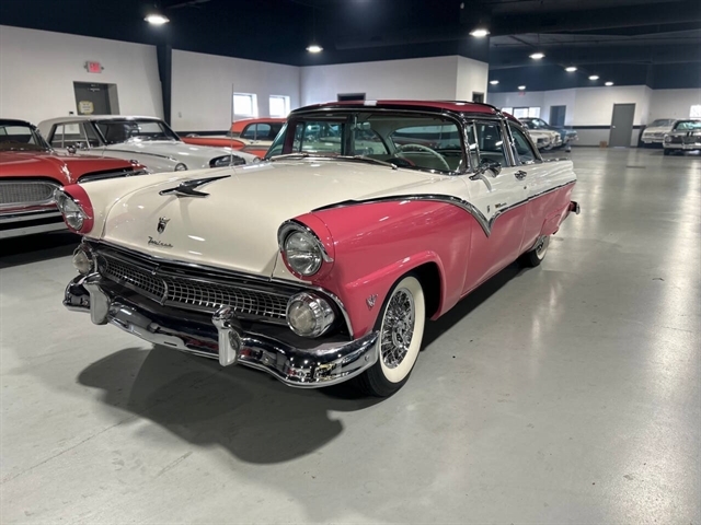 1955 Ford Fairlane Crown Victoria 1955 Fords were totally redesigned inside and out from the 1954 version, the bodies were longer, lower, and wider even though the ‘55 models used the same backlight speedometer first introduced in 1954, the rest of the instrument panel was new. A new Fairlane series replaced the Crestline as the top trim level. The contemporary interest in horsepower and speed was reflected in two new large overhead valve V-8 engines. The Fairlane series was the top trim level for 1955 and included chrome window and A pillar moldings, chrome eyebrows on the headlight doors and a chrome side sweep molding plus all custom line trim. Our example is a Fairlane Crown Victoria two-door hardtop, which includes the decorative chrome tiara band that wraps across the roof panel. Tropical Rose and Snowshoe White 2 tone colors that scream 1950s! Interior is OEM and factory correct with the pink and white two-tone theme carried throughout the passenger compartment as well. Just a gorgeous car that drives as good as it looks. Powered by the venerable 272 CI V-8 with four-barrel carburetor mated to a three-speed manual transmission, a strong runner to say the least. Our Crown Victoria is equipped with power steering, power windows, power seat, Panasonic stereo with tape deck, aftermarket temp and oil PSI gauges and more. Riding on a set of Coker classic wide white wall tires mounted on a set of chrome wire wheels that set it off nicely.