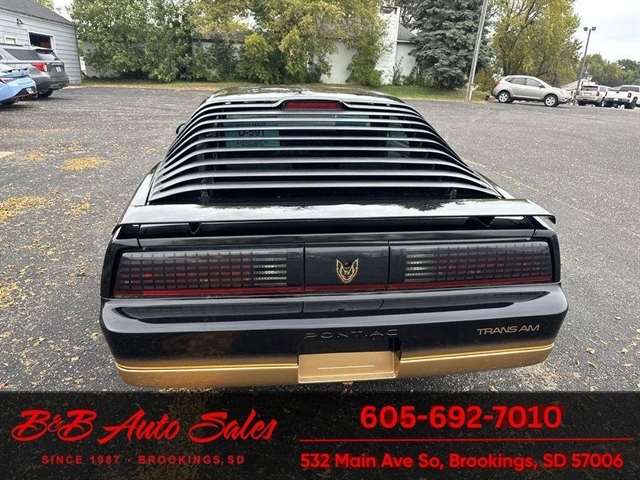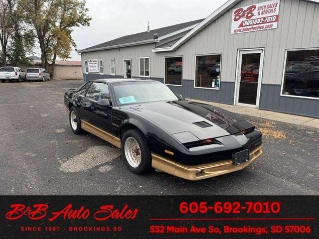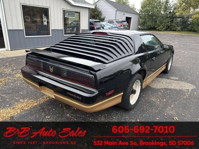 *5.0 Tuned Port V8*One Family Owned*T-Tops*Automatic*60,000 low miles MECHANICAL- This Firebird has been thru our inspection and we replaced the blower motor and converted AC to R134. EXTERIOR- The body is in great shape. It has had a repaint at one time an a nice job. It has a good shine to it with no rust issues. See the video for an up close inspection. Text Dirk at 605-695-7391 for running and driving video`sINTERIOR- The interior is in good shape with no issues.DIRK`S COMMENTS- With 38 years of experience I will give you my opinion of the Firebird. It is a cool car and being a 1 family owned car from Huron it`s whole life has some cool history. A great color combination and you can`t beat a black T/A for looks. UNDERNEATH- The underneath is solid, there is some surface rust from being in storage. History- A car from Huron .SD and one family owned. TEST DRIVE- We personally test drive our vehicles so we know what they drive like. I have drove this one 40 miles and it drives good.Located at 324 W Main White,SD 57276BUY WITH CONFIDENCE as this 1986 Pontiac Firebird has gone thru inspection and test drive. We personally work and drive these ourselves so can answer any questions you may have. We show you any issues with over 100 pictures and videos of a walk around, running and driving.VALUE- We price our vehicles to market value and try to be one of the best prices of vehicles in comparable condition. Our goal is to give you a good buy on a vehicle you are going to have fun with and enjoy. We do have a document fee but only $50 which is lower than most other dealers.LIKE IT OR RETURN IT- As being in business for 38 years we do not want to sell anybody a vehicle they do not want. As many of our vehicles are sold site unseen we will take the vehicle back and give a refund minus shipping and a restocking fee. You are responsible for the shipping both ways and a $1000 restocking fee. You have 3 days to notify us you are not happy with the vehicle and we will start the return process. Ask for more details.VIDEOS- Call, text or email for videos of driving the vehicle and of the engine running and accessories working. Text Dirk at 605-695-7391. Click here to apply for financing: Credit App Call or text Dirk at 605-695-7391 or Darren 605-695-9555 with any questions. B and B Auto Sales, 324 W Main White,SD 57276
