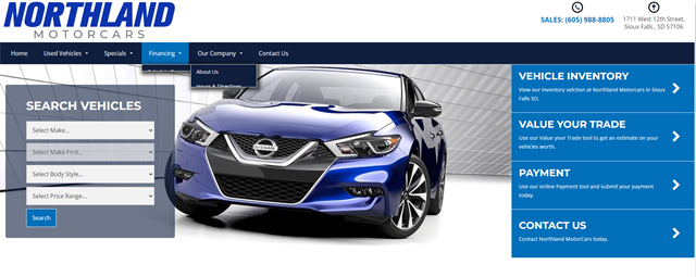 Northland Motorcars serves South Dakota, Iowa, Minnesota, Nebraska and The Surrounding Area. All vehicles are Fully Serviced & Inspected! Please Contact Us For Your No Hassle Experience and Save Time In The Store By Starting The Process Online. We Look Forward To Taking Care Of Your Car Needs Today and In The Future! Free Carfax Report! Financing (WAC) and Vehicle Service Contract Options Available! Come Stop By, Call Us at 605-988-8805 or Schedule Your Test Drive Online Today! All Trades Welcome! We make the buying experience painless and pleasant with our aggressive market pricing. Located at 1417 W 12th St Sioux Falls SD 57104.